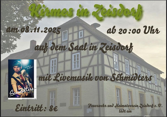 Kirmes in Zeißdorf 2025 Wann: Am 8.11.2025, ab 20:00 Uhr Wo: Saal in Zeißdorf Informationen: + Zu Google Kalender hinzufügen + iCal / Outlook exportieren Die Veranstaltung ist beendet. Kategorie Feuerwehr Offizielle Termine Teile diese Veranstaltung