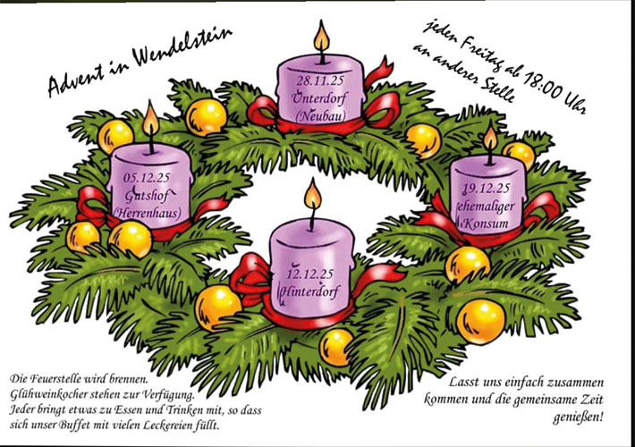 Advent in Wendelstein 2025 Wann: Am 12.12.11.2025, ab 18:00 Uhr Wo: Hinterdorf Informationen: + Zu Google Kalender hinzufügen + iCal / Outlook exportieren Die Veranstaltung ist beendet. Kategorie Offizielle Termine Teile diese Veranstaltung