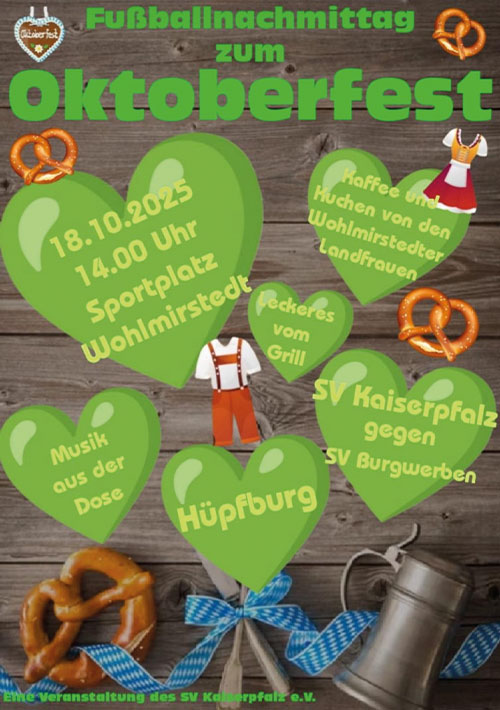 Fußballnachmittag zum Oktoberfest Wohlmirstedt 2025 Wann: Am 18.10.2025, ab 14:00 Uhr Wo: Sportplatz Wohlmirstedt Informationen: + Zu Google Kalender hinzufügen + iCal / Outlook exportieren 00 Tage 00 Stunden 00 Minuten 00 Sekunden Kategorie Offizielle Termine Teile diese Veranstaltung