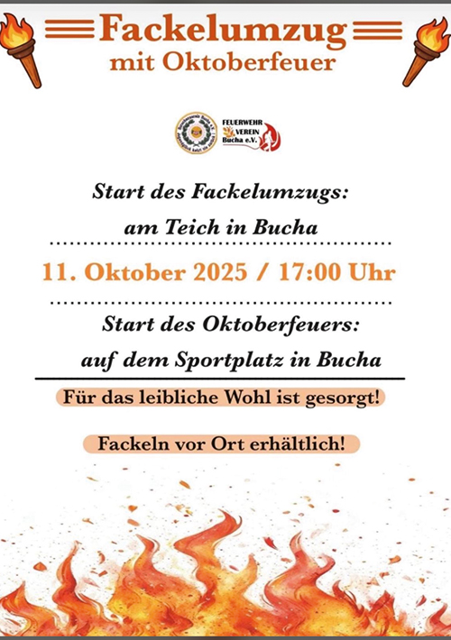Herbsfeuer mit Fackelumzug Wann: Am 11.10.2025, ab 17:00 Uhr Wo: Sportplatz Bucha Informationen: + Zu Google Kalender hinzufügen + iCal / Outlook exportieren 00 Tage 00 Stunden 00 Minuten 00 Sekunden Kategorie Offizielle Termine Teile diese Veranstaltung