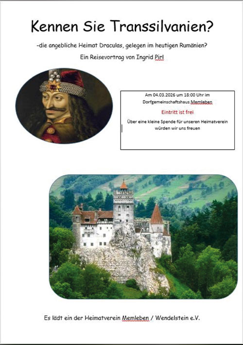 Kennen Sie Transsilvanien Wann: Am 04.03.2026, ab 18:00 Uhr Wo: Heimatverein Memleben / Wendelstein e.V. Informationen: + Zu Google Kalender hinzufügen + iCal / Outlook exportieren 00 Tage 00 Stunden 00 Minuten 00 Sekunden Our DepartmentsStartseite Impressum Datenschutz