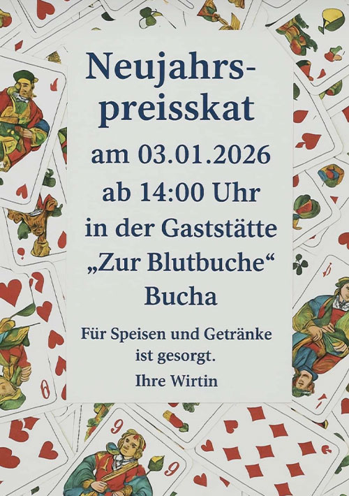 Neujahrspreisskat Bucha 2026 Wann: Am 03.01.2026, ab 14:00 Uhr Wo: “Zur Blutbuche” Bucha Informationen: + Zu Google Kalender hinzufügen + iCal / Outlook exportieren 00 Tage 00 Stunden 00 Minuten 00 Sekunden Kategorie Offizielle Termine Teile diese Veranstaltung