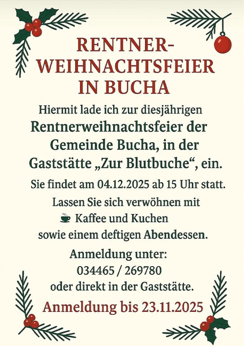 Rentnerweihnachtsfeier in Bucha 2025 Wann: Am 04.12.2025, ab 15:00 Uhr Wo: Gaststätte “Zur Blutbuche” Informationen: + Zu Google Kalender hinzufügen + iCal / Outlook exportieren 00 Tage 00 Stunden 00 Minuten 00 Sekunden Kategorie Offizielle Termine Teile diese Veranstaltung
