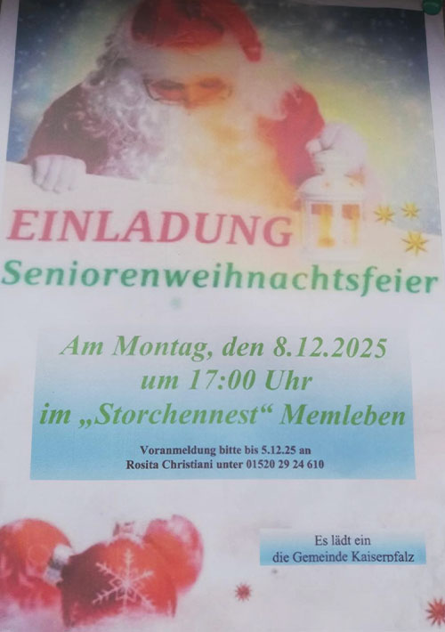 Seniorenweihnachtsfeier in Memleben 2025 Wann: Am 08.12.2025, ab 17:00 Uhr Wo: Im “Storchennest” Memleben Informationen: + Zu Google Kalender hinzufügen + iCal / Outlook exportieren 00 Tage 00 Stunden 00 Minuten 00 Sekunden Kategorie Offizielle Termine Teile diese Veranstaltung