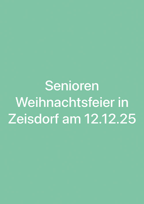 Seniorenweihnachtsfeier in Zeisdorf 2025 Wann: Am 12.12.2025 Informationen: + Zu Google Kalender hinzufügen + iCal / Outlook exportieren 00 Tage 00 Stunden 00 Minuten 00 Sekunden Kategorie Offizielle Termine Teile diese Veranstaltung