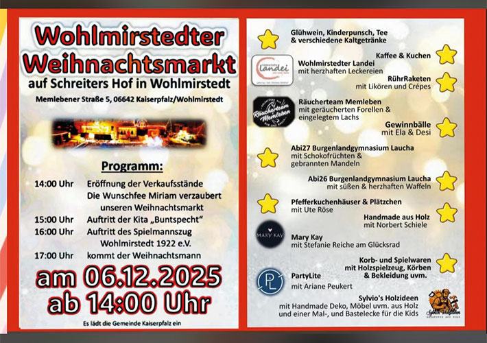 Wohlmirstedter Weihnachtsmarkt 2025 Wann: Am 06.12.2025 ab 14:00 Uhr Wo: auf Schreiters Hof in Wohlmirstedt Informationen: + Zu Google Kalender hinzufügen + iCal / Outlook exportieren 00 Tage 00 Stunden 00 Minuten 00 Sekunden Kategorie Offizielle Termine Teile diese Veranstaltung